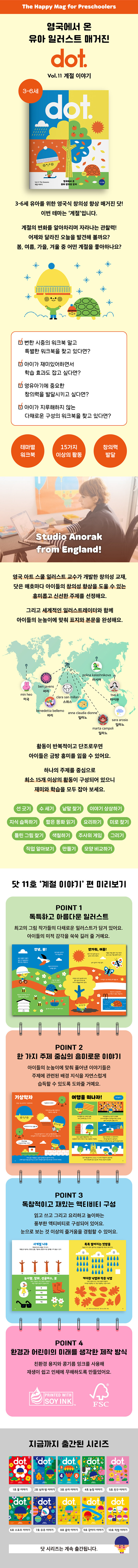 3-6세 독자들을 위한 창의미술 교재로 유명한 영국의 인기 일러스트 매거진 닷! 특유의 고급스러움을 더욱 강화한 한국어판이 공식 출간되었어요. 일상에서 접하는 흥미로운 주제 한 가지를 선정해 읽기와 쓰기, 색칠하기, 그리기, 요리하기 등 주제와 관련한 다채로운 콘텐츠들을 담았어요. 먼저 출간된 5-9세 어린이 매거진 아노락과 마찬가지로, 해외의 여러 아티스트가 작업한 감각적인 일러스트를 가득 싣고 있답니다. 곳곳의 재미난 이야기와 액티비티는 아이들이 더욱 능동적으로 창의적인 활동에 참여할 수 있도록 돕는 역할을 해요. 21세기 창의력의 시대, TV나 스마트폰은 잠시 옆으로 치워두고 닷과 함께 읽고, 그리고, 쓰면서 아이들의 상상력과 창의력을 쑥쑥 길러 보세요!