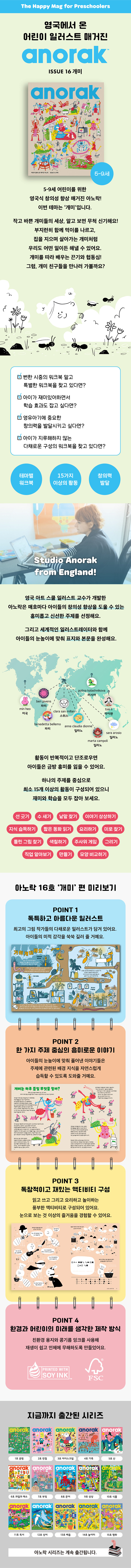 2006년에 영국에서 처음 창간되어 국내외에서 인기를 끌고 있는 아노락은 세계적인 아티스트들이 그린 일러스트 중심의 구성과 독특하고 재미있는 콘텐츠를 자랑합니다. 이탈리아, 스페인, 독일, 네덜란드 등 유럽 여러 나라에서 이미 최고의 창의성 교재로 인정받고 있지요! 아노락의 가장 큰 장점은 아이들이 스스로 경험하고 싶어하는 매력적인 일러스트 콘텐츠에 있습니다. 아노락은 특유의 고급스러움과 자유분방함을 풍부한 색감의 일러스트로 표현하며, 매호 초등학교 교과 과정과 연계된 주제와 내용을 선정해 수준 높은 액티비티를 제공함으로써, 아이들이 양질의 창의 미술 교육을 즐겁게 경험할 수 있어요. 상상력을 자극하는 스토리와 그림들은 아이들의 잠재된 창의력을 깨워줄 거예요!